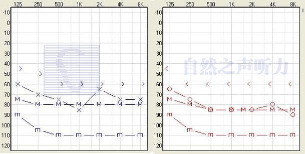 自然之聲檢查結(jié)果:耳光鏡檢查:外耳道、鼓膜正常,純音測聽結(jié)果如下